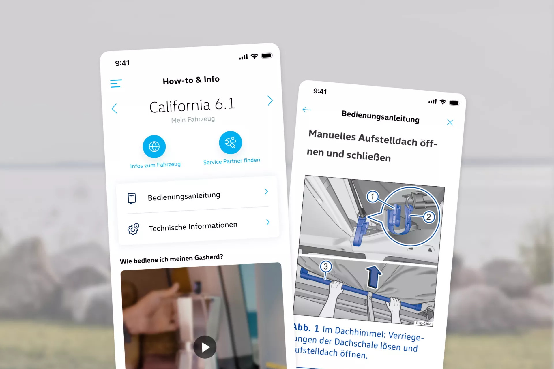 Najdôležitejšie informácie a údaje máte vždy poruke: V časti „Ako na to a informácie“ nájdete užitočné inštruktážne videá o modelovom rade California, veľa detailov o vozidlách a servisných partneroch vozidiel California vo vašom okolí.
